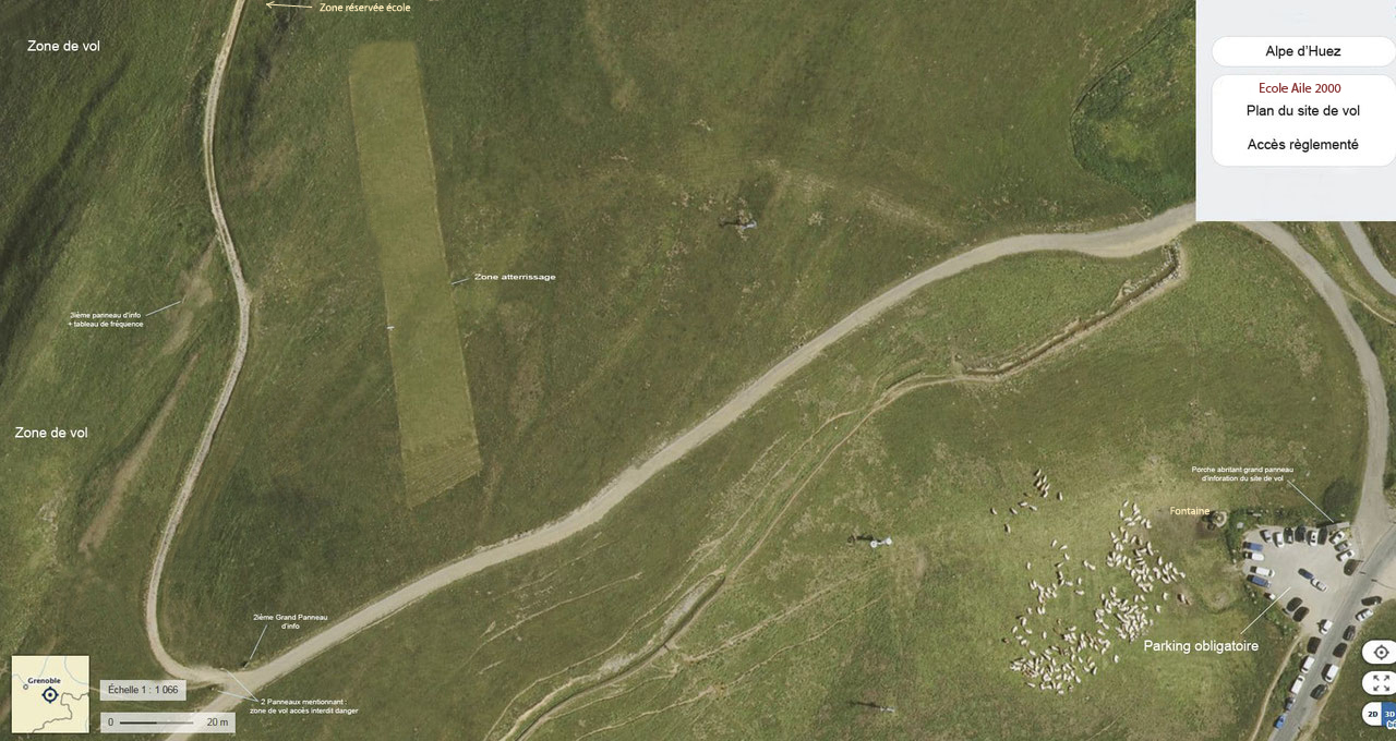 Parking situé au pied de la route en terre obligatoire (devant le panneau aéromodélisme) circulation et stationnement strictement interdits en dehors de cette zone (loi montagne). Seuls les véhicules des Moniteurs de l'école sont autorisés à accéder au parking de la zone école.